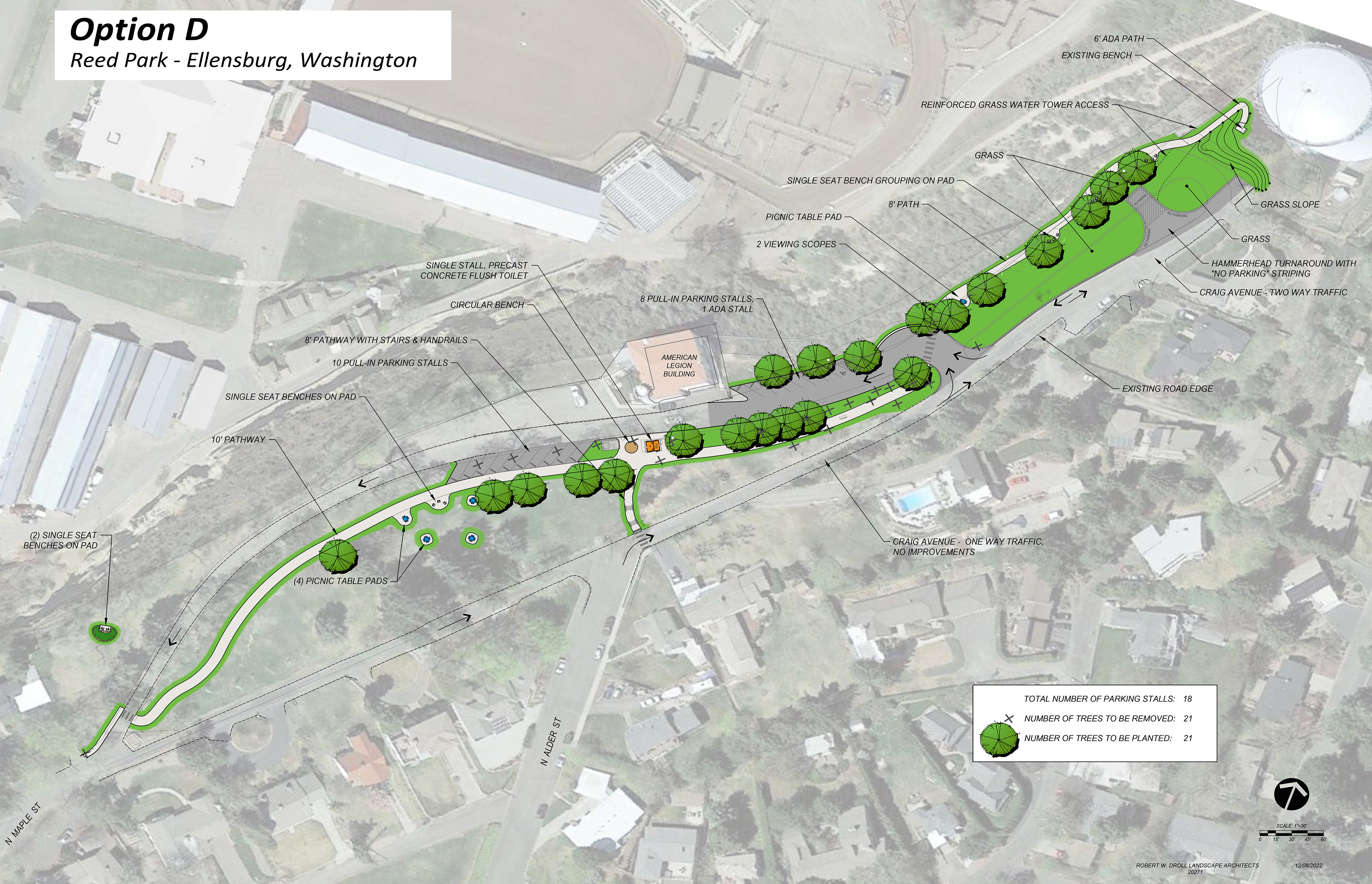 At their March 18, 2024 City Council Meeting, the Ellensburg City Council unanimously passed 'Reed Park Master Plan Option A (February 2024)' 7-0. The plan addresses pedestrian safety concerns brought forward by the community by creating a separated pathway throughout the park, maintains the total number of parking stalls at the park and American Legion, preserves the overlook viewpoint, and provides much needed park infrastructure improvements. City staff would like to thank the community for all the feedback that has been provided regarding the plan over the last two years. Throughout the master planning process, we have been reminded time and again how important this park is to the history of our community, and we believe the plan adopted by Council will continue to honor that history and create many more memories for generations to come.