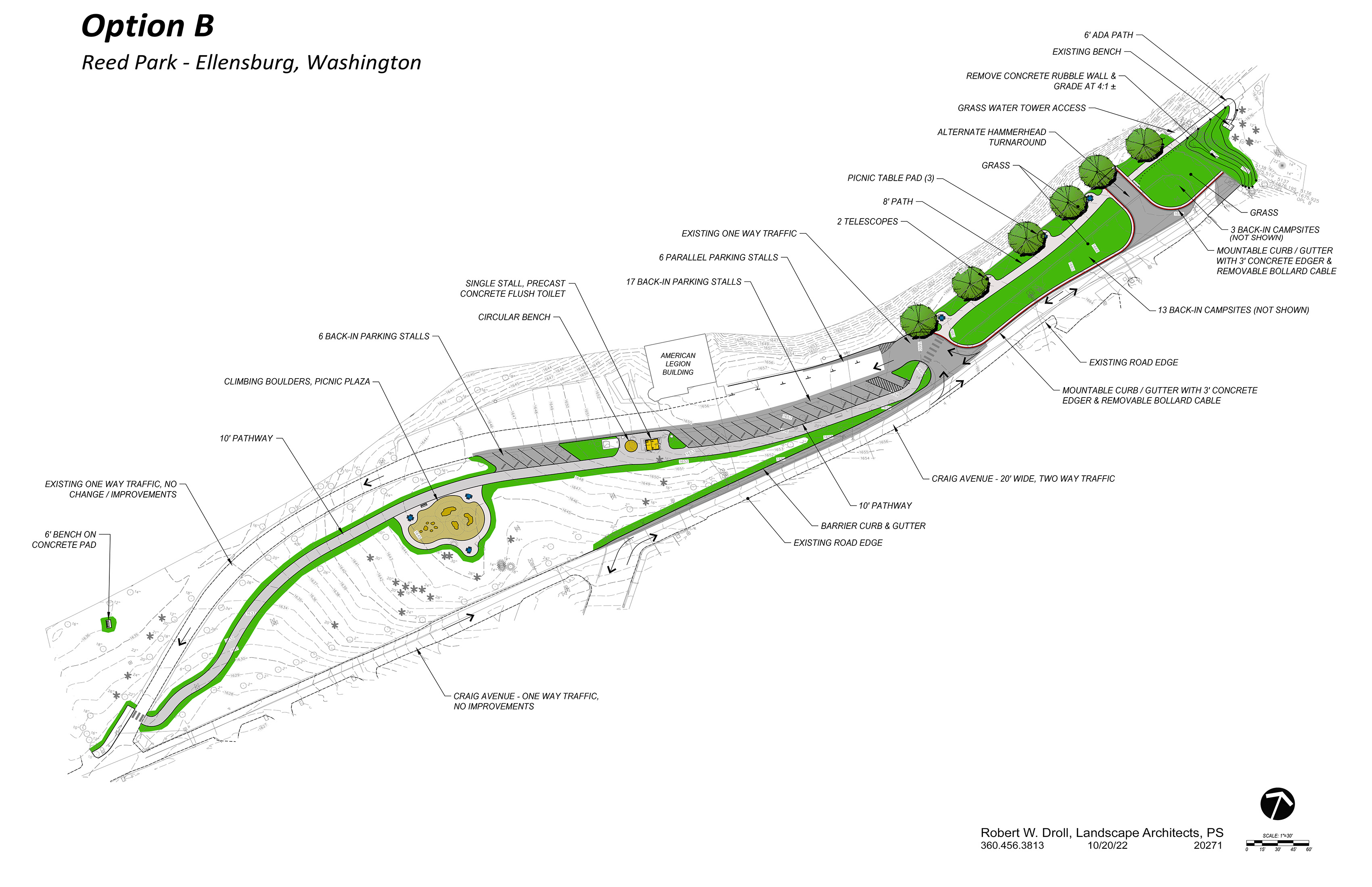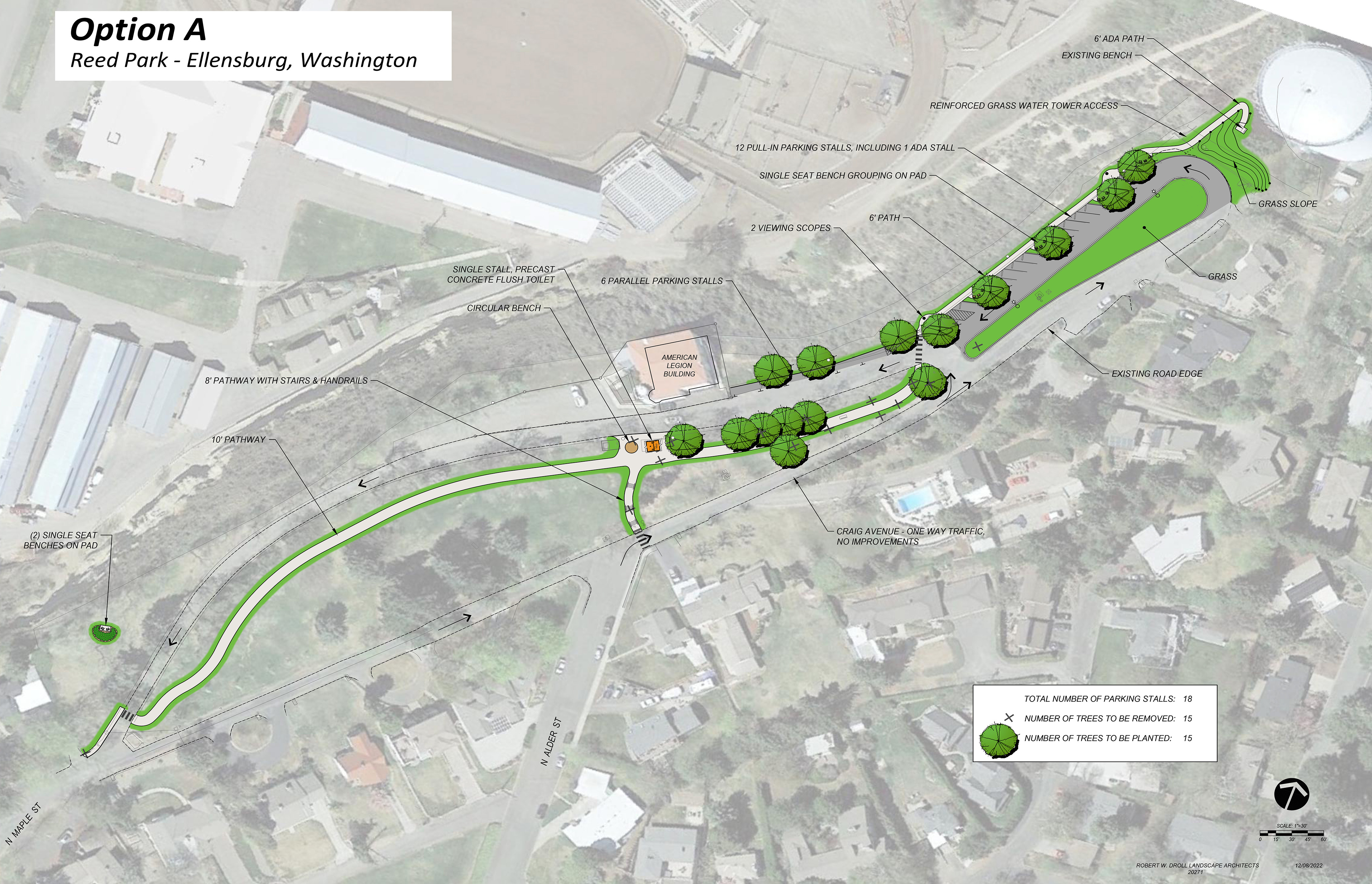 At their March 18, 2024 City Council Meeting, the Ellensburg City Council unanimously passed 'Reed Park Master Plan Option A (February 2024)' 7-0. The plan addresses pedestrian safety concerns brought forward by the community by creating a separated pathway throughout the park, maintains the total number of parking stalls at the park and American Legion, preserves the overlook viewpoint, and provides much needed park infrastructure improvements. City staff would like to thank the community for all the feedback that has been provided regarding the plan over the last two years. Throughout the master planning process, we have been reminded time and again how important this park is to the history of our community, and we believe the plan adopted by Council will continue to honor that history and create many more memories for generations to come.
